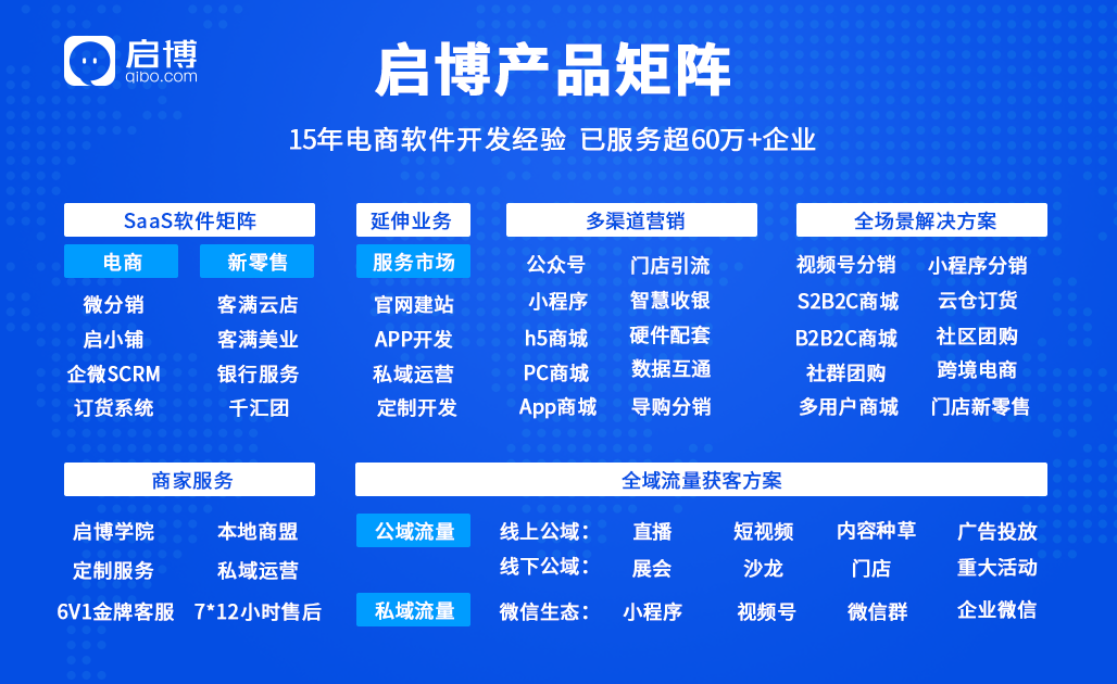 随着微信电商基础设施不断完善,启博已拥有15年的电商软件开发技术经验,启博自开发的微分销商城系统可以为企业品牌提供从获客、连接到转化、维系的全链路解决方案与服务。