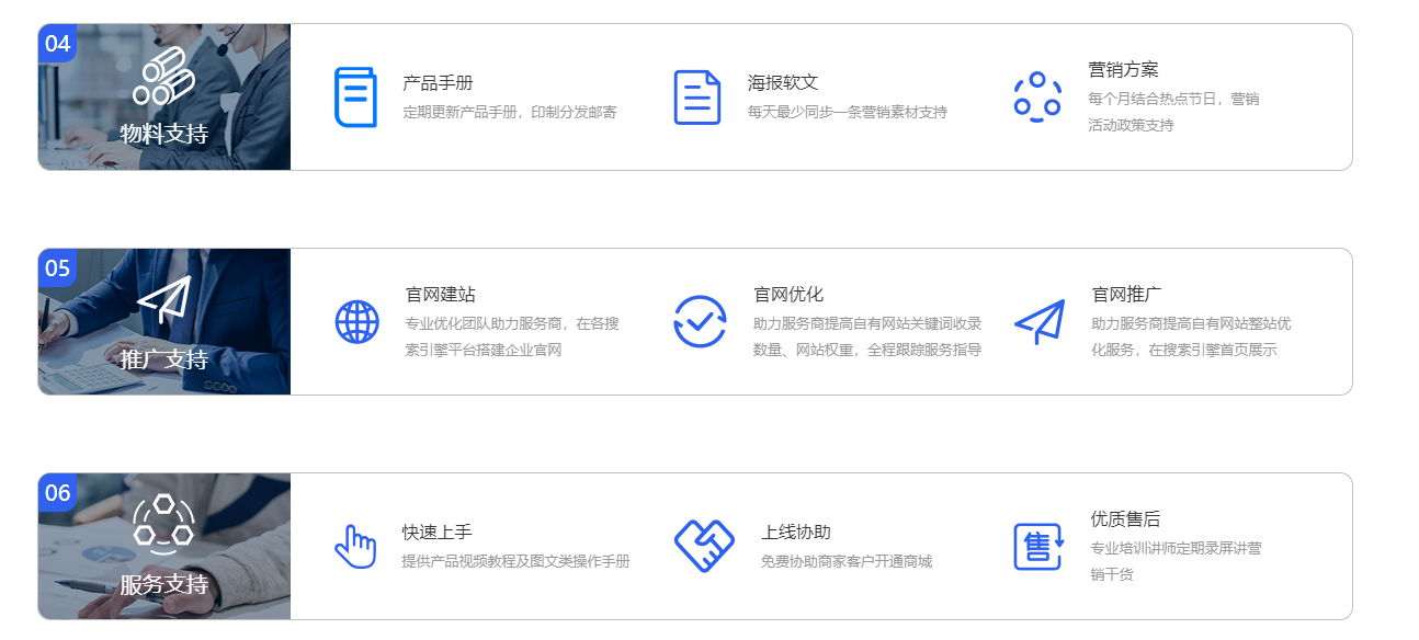 启博作为新经济形态下的电商数字化解决方案公司,在赋能各类B端商户的同时,对外宣布将启动“共创共赢 让创业更简单计划”,并有“优厚政策”对代理商进行重点扶持,共同掘金社交电商新赛道。启博电商SaaS渠道招商产品有微分销商城代理、小程序代理、客满云店代理、客满美业代理、千汇团代理、官网建站、官网优化业务代理等,涵盖公私域主流解决方案和经营场景。